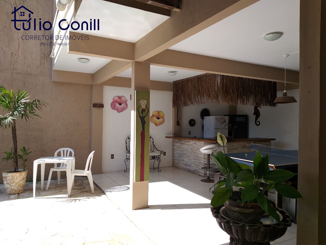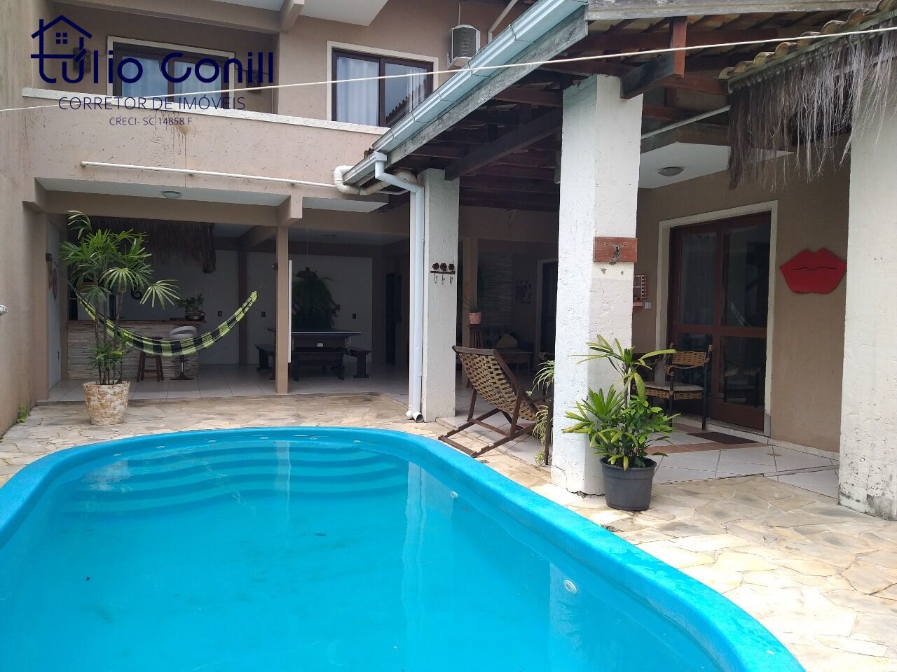 A Área de convivência é integrada a casa com salão de jogos, mesa de sinuca, com o ping pong e em uma mesa para refeições grande, piscina privativa com escadas. Frente a piscina bar em estilo havaiano.